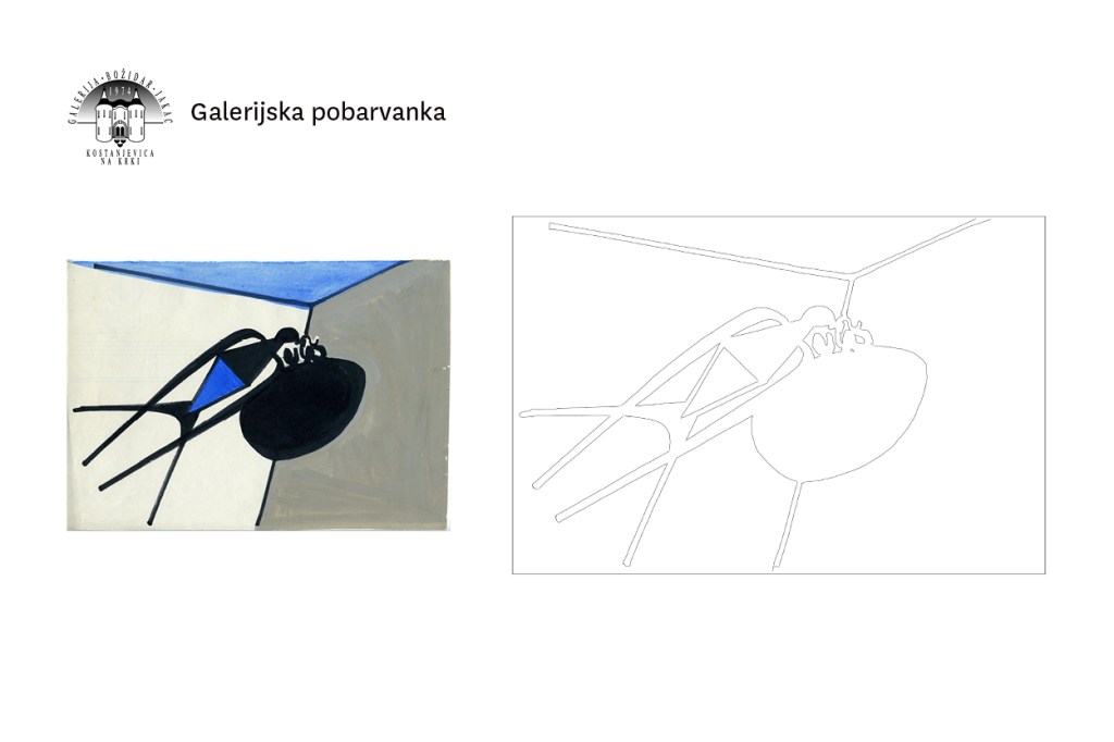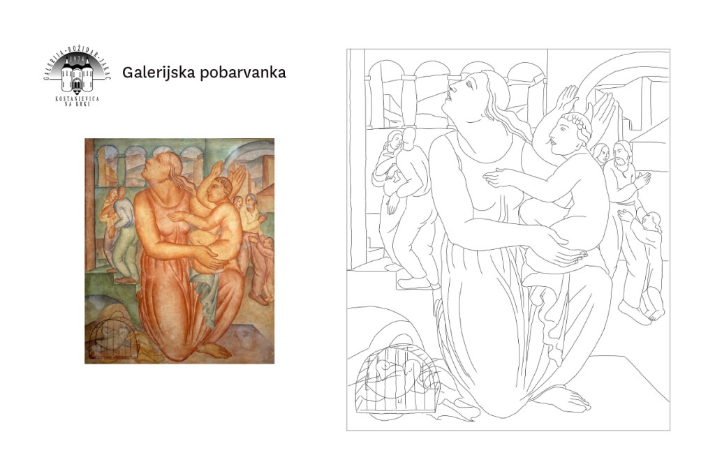 V pobarvanke smo preobrazili tri umetniška dela iz zbirke GBJ. Lastovičje gnezdo je umetnik Zoran Didek prepričljivo naslikal le s tremi toni v kombinaciji tuša in gvaša. Cesarjeva kočija je ena od štiriindvajsetih ilustracij Toneta Kralja za prepoznavno slikanico Martin Krpan, ki jih hranimo v zbirki galerije. Pobarvanka svetopisemskega motiva Daritev v templju je nastala po freski kostanjeviškega umetnika Jožeta Gorjupa, ki jo skrbno hranimo v depoju.