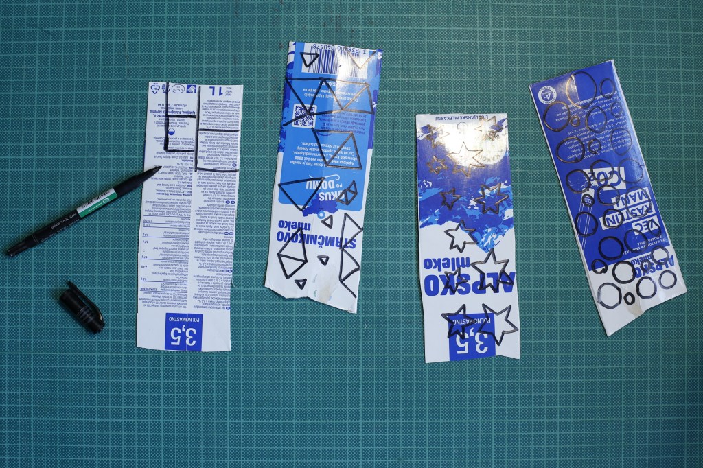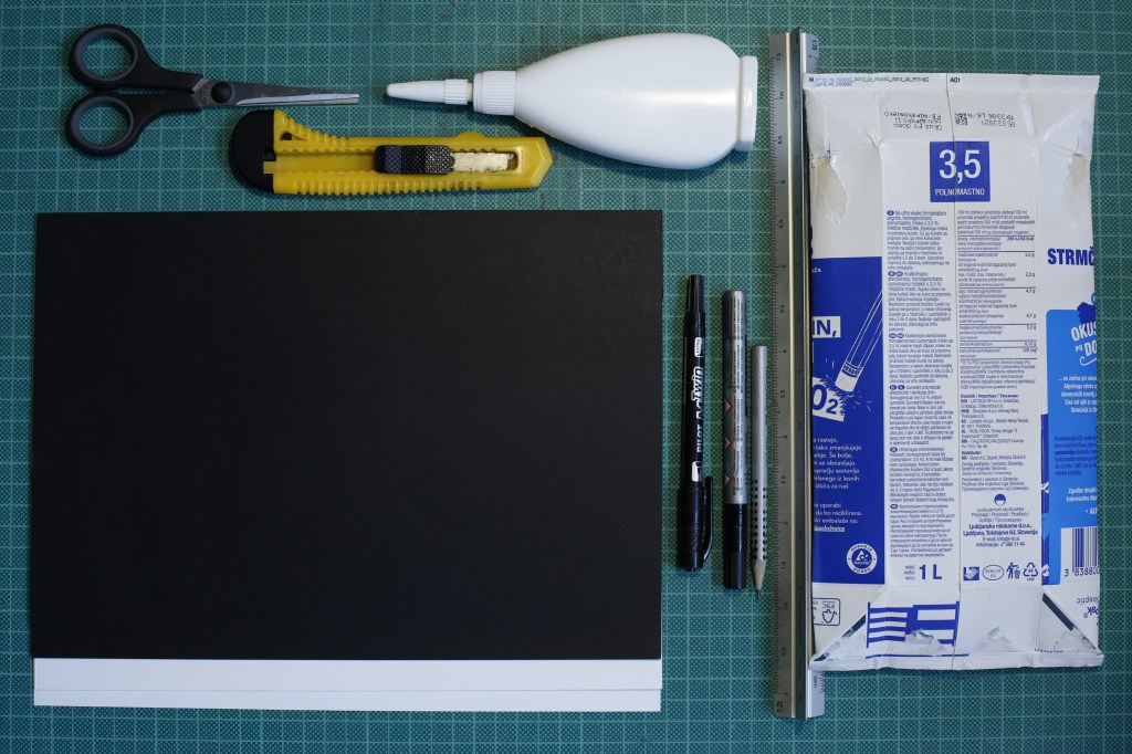POTREBŠČINE: tetrapak, trši papir (risalni list, šeleshamer), barvni papir, škarje / olfa nož, ravnilo, lepilo, svinčnik, alkoholni (in srebrn) flomaster