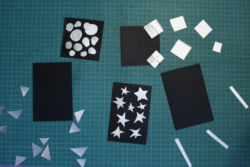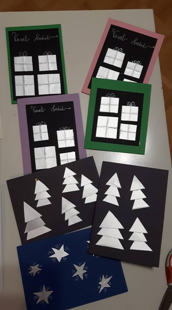 Izrezane oblike lahko po želji dopolniš s svetlečim (srebrnim) flomastrom, bleščicami, risbo, barvami … Ko se lepilo posuši samo še prilepi izdelke na belo osnovo in voščilnice so pripravljene, da vanje zapišeš lepe želje.