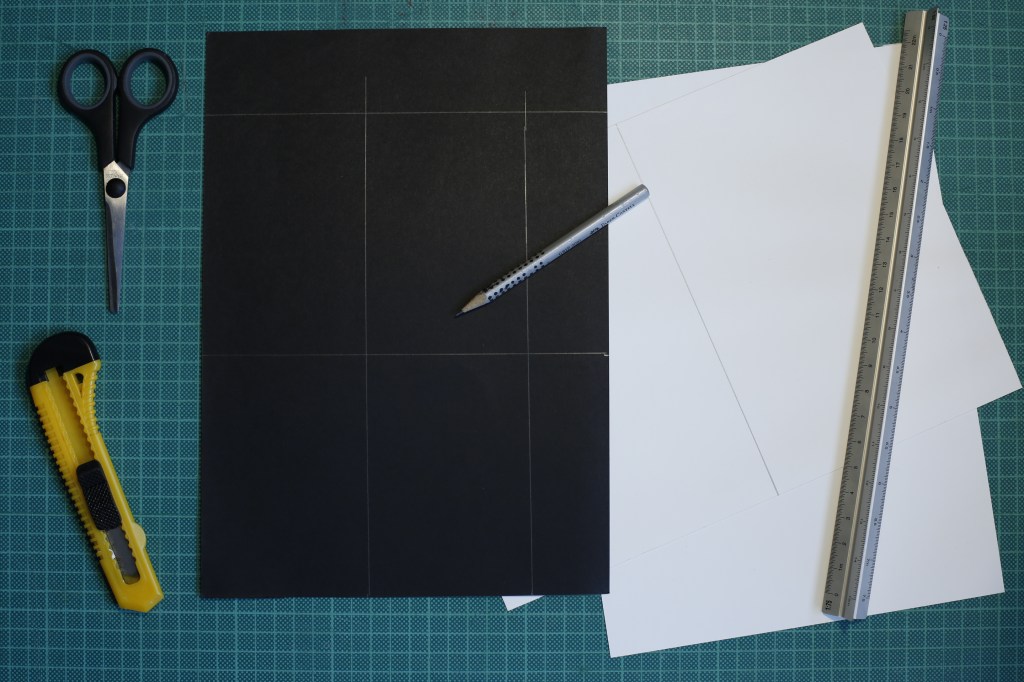 Risalni list ali šeleshamer izreži v format voščilnice. Klasična kuverta je velikosti 11,4×16,2 cm. Predlagamo, da izrežeš list v velikosti 30×10 cm, ki ga nato prepogneš. Velikost voščilnice bo tako 15×10 cm in se bo zlahka vložila v kuverto. Da se bodo koščki iz tetrapaka bolje videli uporabi črn oz. barvni papir, ki naj bo nekoliko manjši – 14×9 cm.
