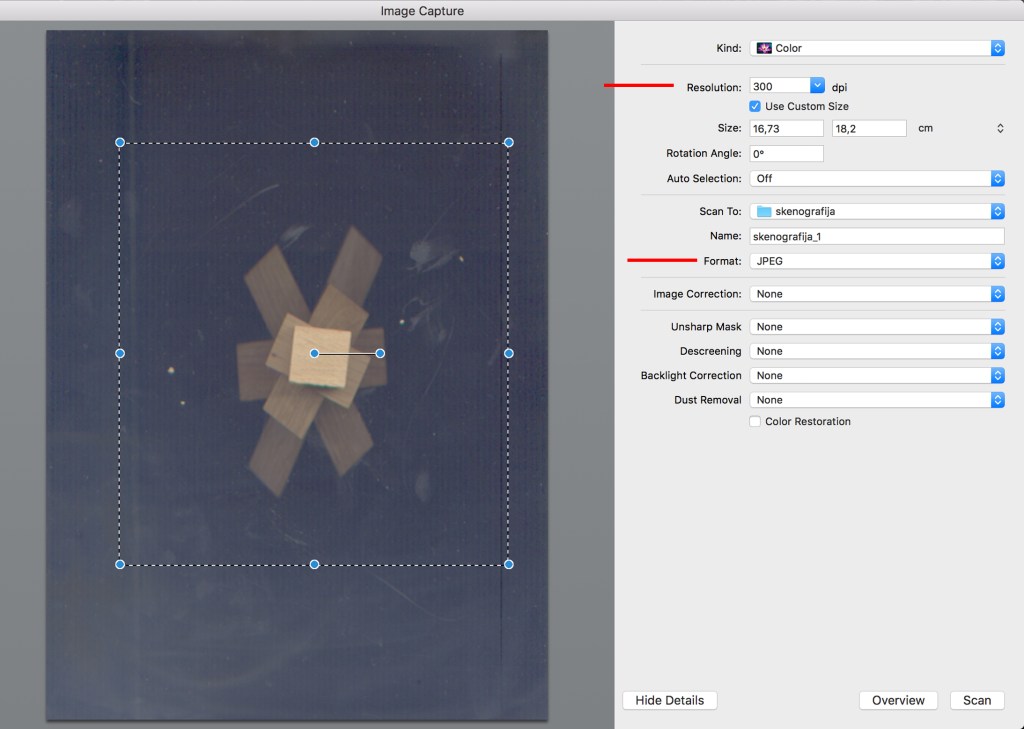 Pokrova med skeniranjem ne potrebujemo, zato naj ostane odprt (če naprava to omogoča, pokrov odstranimo). Ko smo zadovoljni s postavitvijo, v programu pritisnemo gumb skeniraj (scan). Na zaslonu se bo kmalu pokazala prva skenirana fotografija, s katero se začne raziskovanje skenografije!