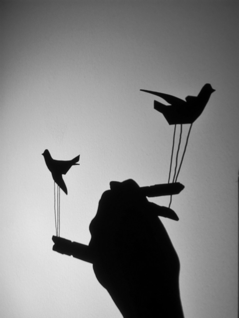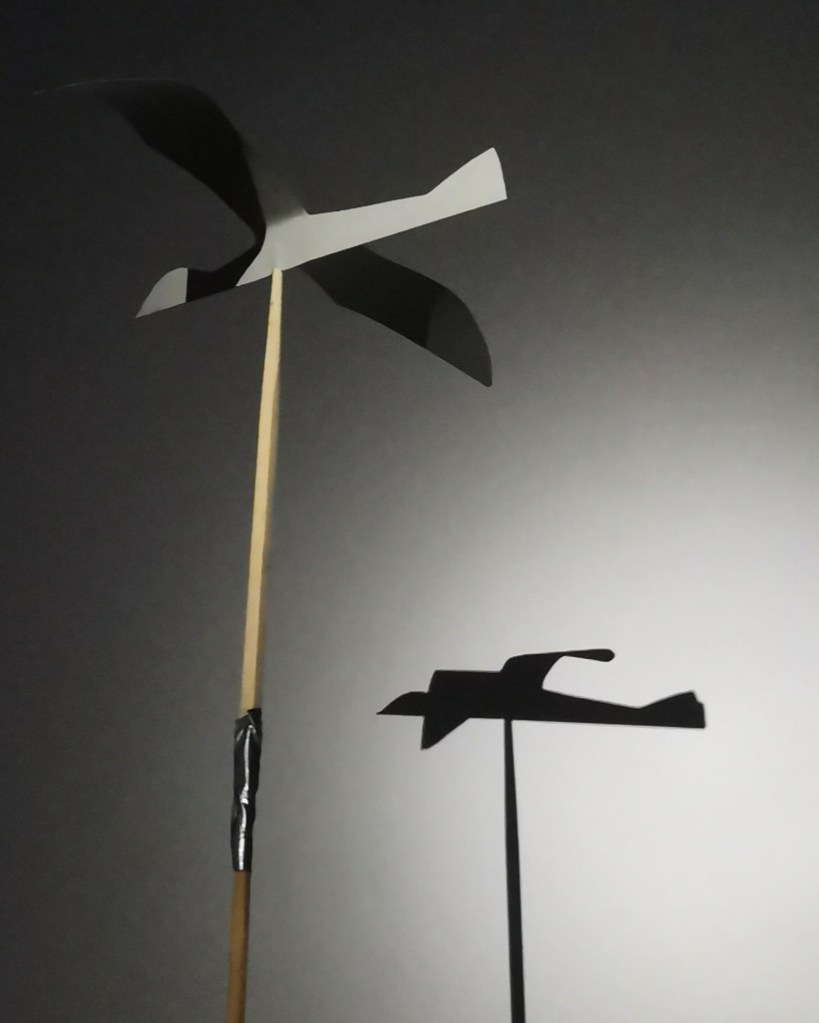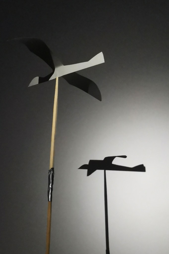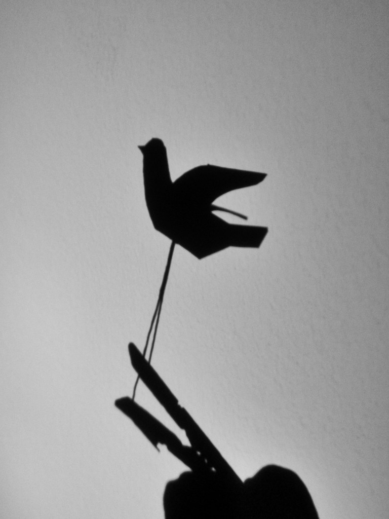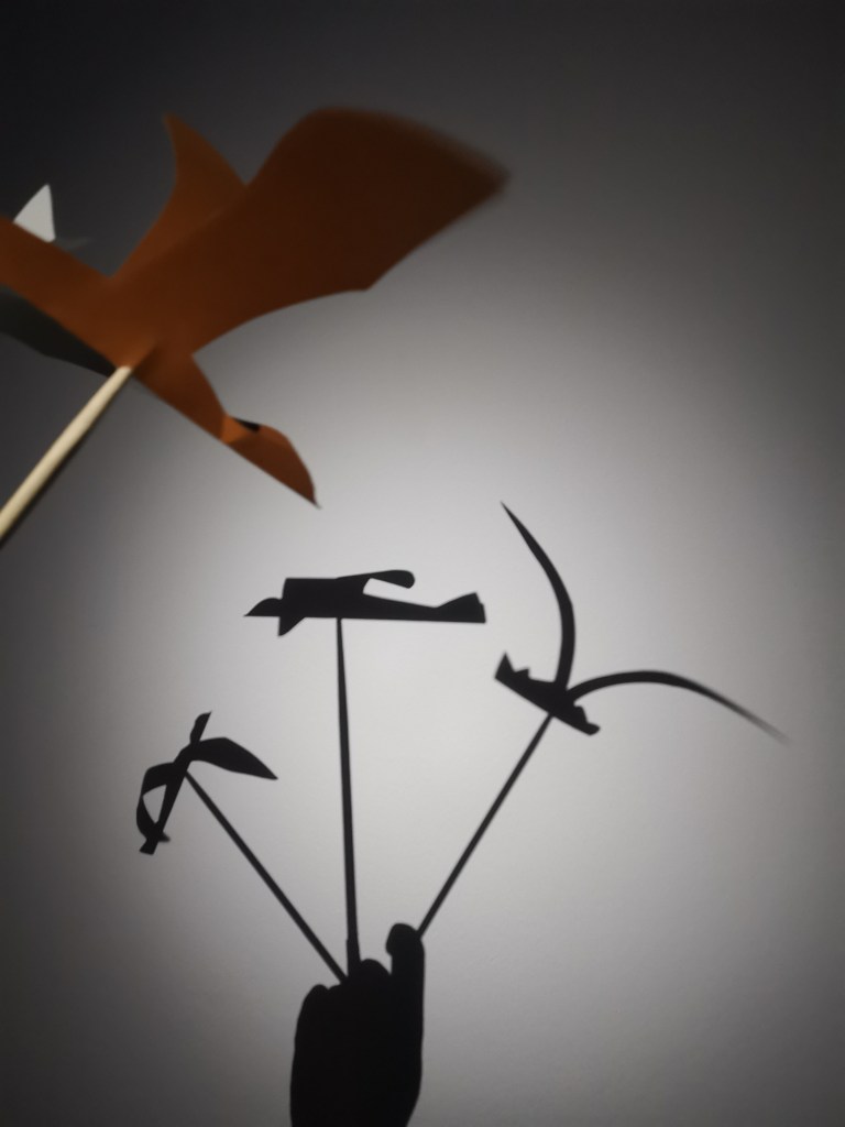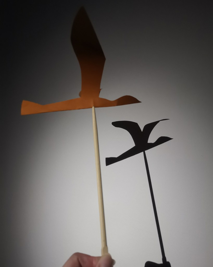 Sedaj je čas za animiranje lutk. S premikanjem roke in igro svetlobe ter senc bodo ptice zaživele. Ptica na ščipalki bo krila odpirala kontrolirano – vedno enako, s pritiskom prstov lahko spreminjamo samo hitrost njenega gibanja. Lutka na palici je bolj nepredvidljiva. Ptico postavimo pred luč, svetilko ali na sončno svetlobo, kam bo poletela njena senca?