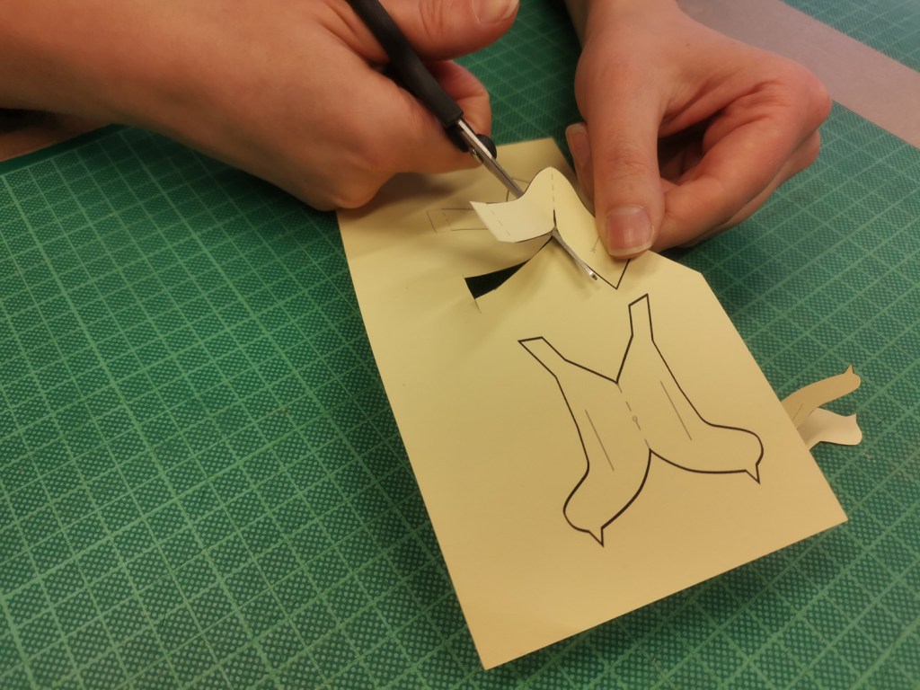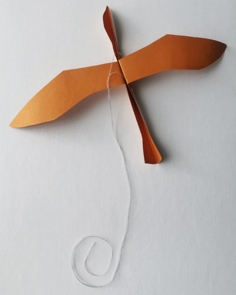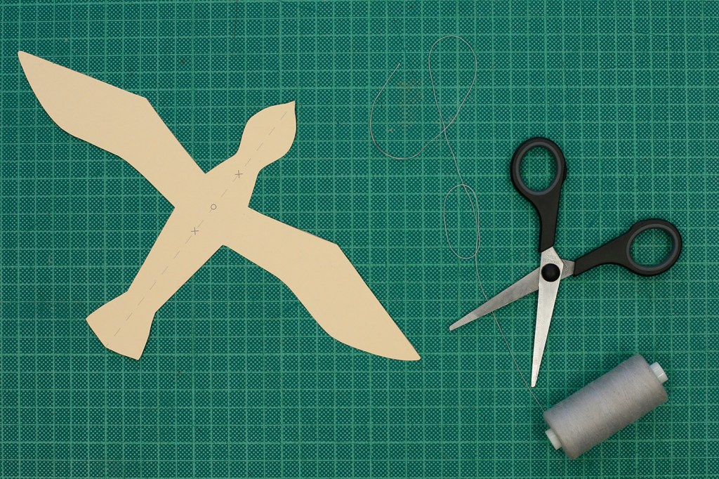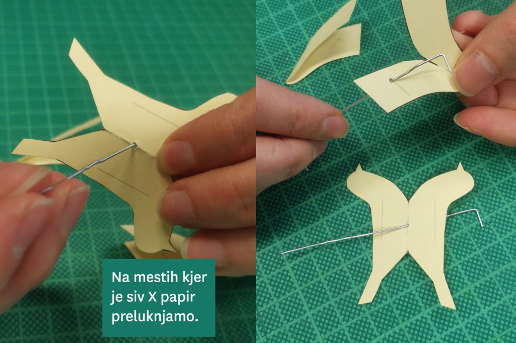 Na predlogi so ločeno natisnjeni trup in krila, izrežemo jih in prepognemo po črtkani črti. Vsak del ima označen križec, kjer je potrebno narediti luknjo. Pomagamo si z žico in previdno prebodemo papir.