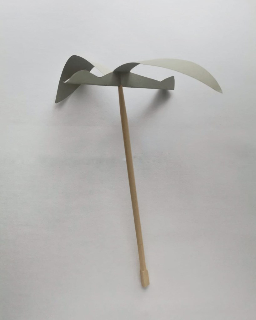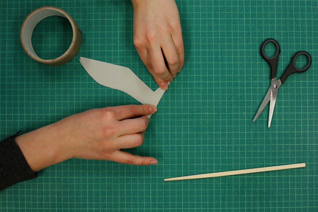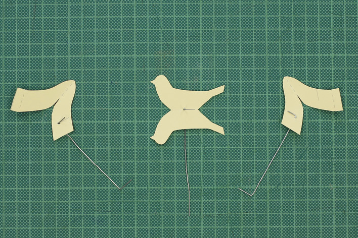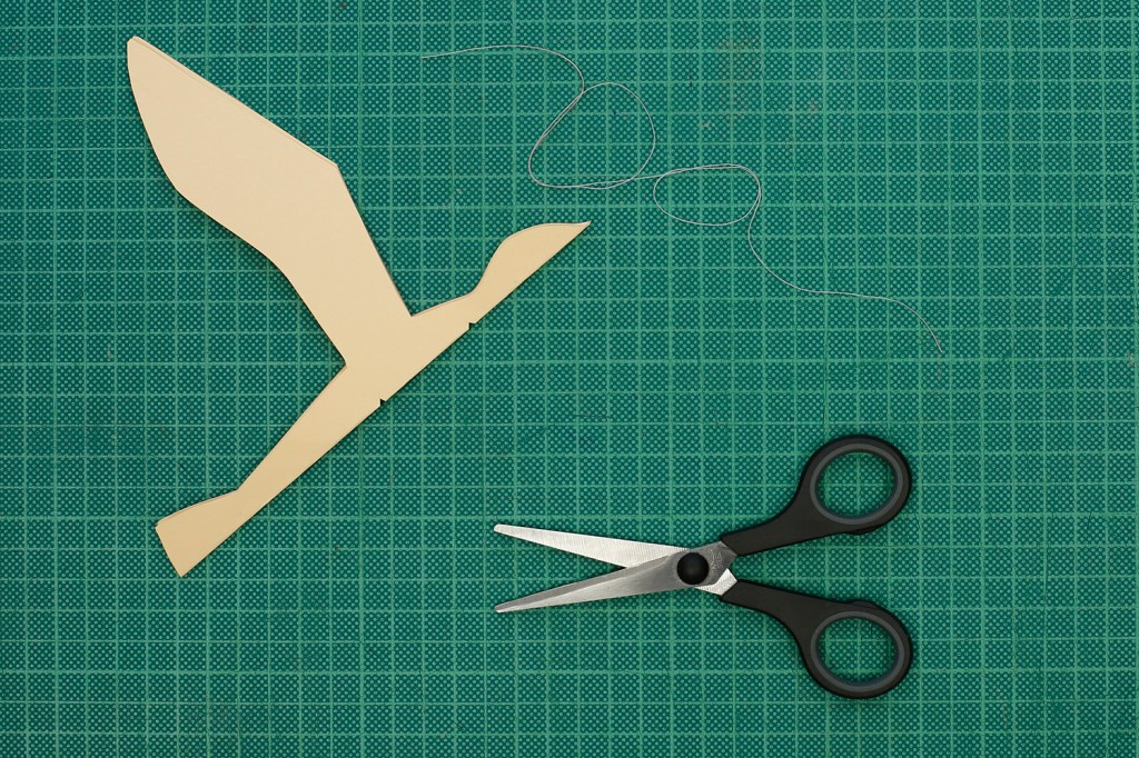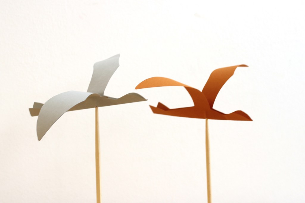 Izrežemo oblike ptice po natisnjeni predlogi ali jo narišemo po svoji domišljiji. Ptico prepognemo po črti, ki nakazuje sredino. S krogcem je na predlogi označeno mesto kjer naredimo luknjico. Skoznjo potisnemo leseno palico in in jo na notranjo stran papirja prilepimo s selotejpom. Namesto palice lahko za vodilo uporabimo tudi sukanec, ga napeljemo skozi dve luknji na trupu in poiščemo težišče, da ptica leži vodoravno.