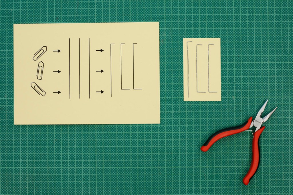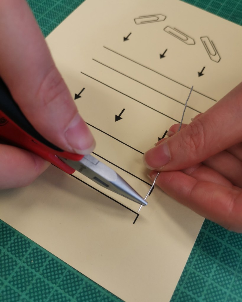 Sponke razvijemo in zravnamo s pomočjo klešč. Upognemo jih kot je prikazano na predlogi. Če so sponke nekoliko krajše / daljše dolžino prepogiba prilagodimo. Žice bodo služile kot vodila, ki bodo omogočala ptici premikanje kril.