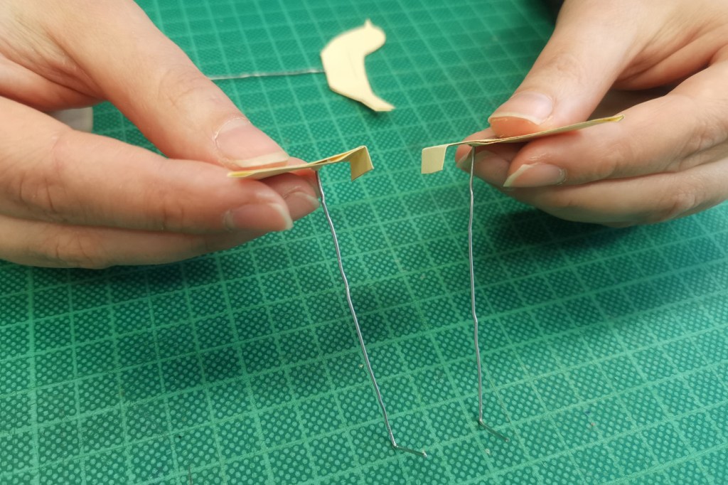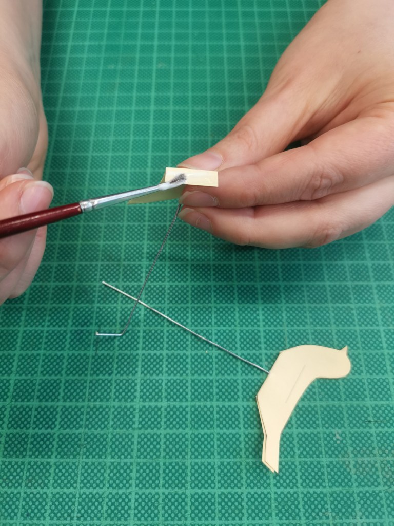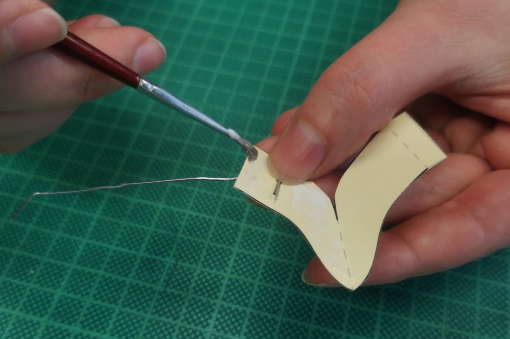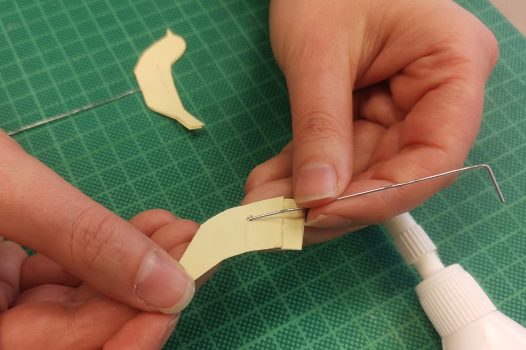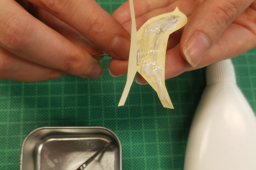 Žico (s stranjo kjer je prepogib krajši) potisnemo skozi luknjico. Siva črta kaže smer v katero naj bo prepognjen konec obrnjen. Krilo previdno namažemo z lepilom. Pomembno je, da se žica ne stika z lepilom (saj se mora žička premikati), zato nanesemo lepilo samo okoli žice in zlepimo.