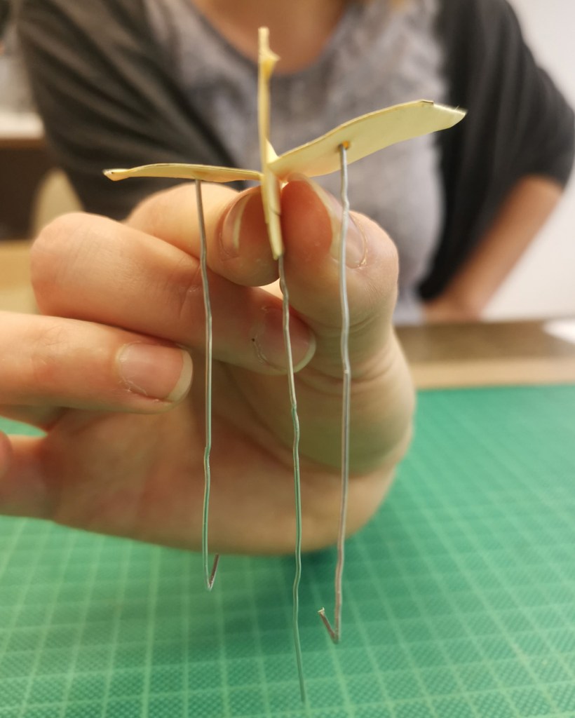 Sledi vstavljanje žice v krila in trup, s katerimi bomo kasneje pritrdili ptico na ščipalko.
