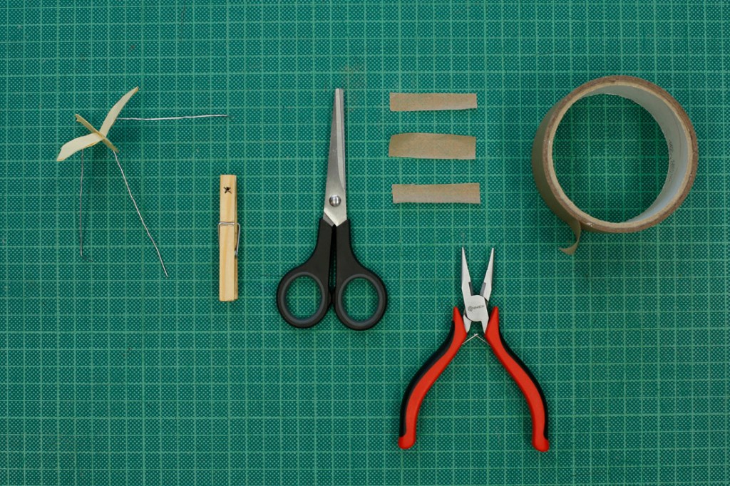 Odrežemo tri daljše (cca 4 cm) kose krep selotejpa, ki naj bodo široki cca 0,5 cm. Sredinsko – ravno žico potisnemo skozi luknjo v ščipalki.