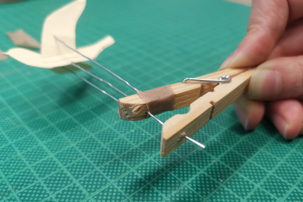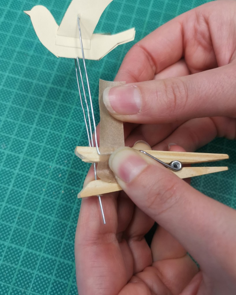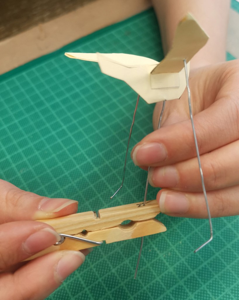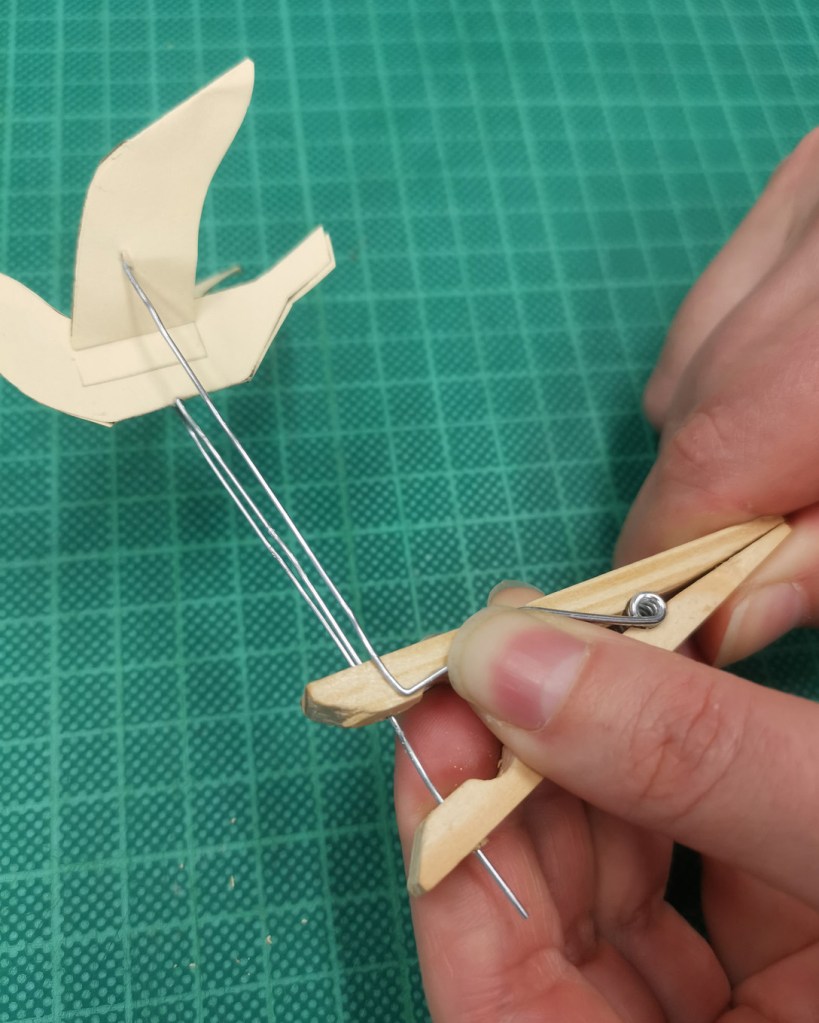 Žico, ki gre skozi ščipalko je potrebno še upogniti in nato prilepiti na ščipalko. Preden jo prepognemo preverimo kako dolg naj bo ukrivljen del. Krila naj bodo pri zaprti ščipalki usmerjena navzdol, da bo ptica lahko letela. Žico lahko prepognemo večkrat, da vidimo, kdaj se krila dobro premikajo. Ko smo zadovoljni s premikanjem kril prilepimo še zadnjo žico na ščipalko. Ptica je pripravljena, da poleti!