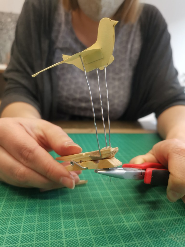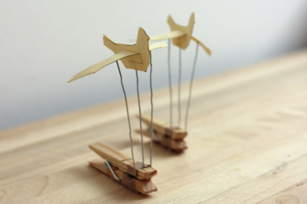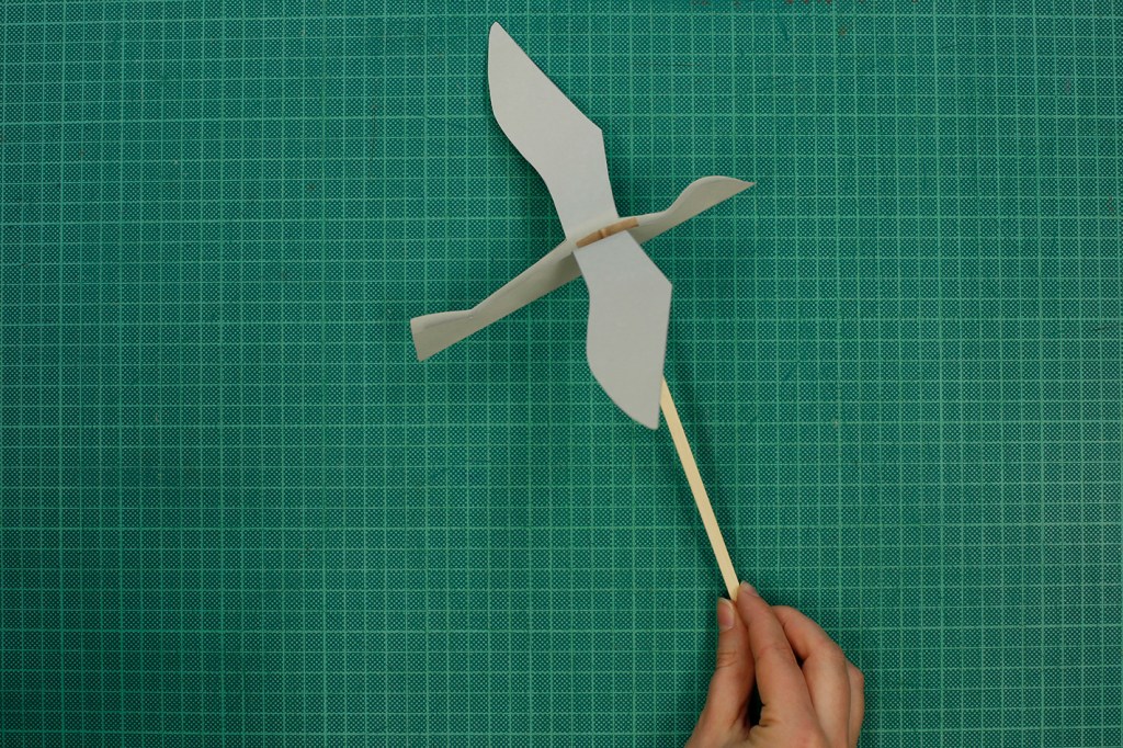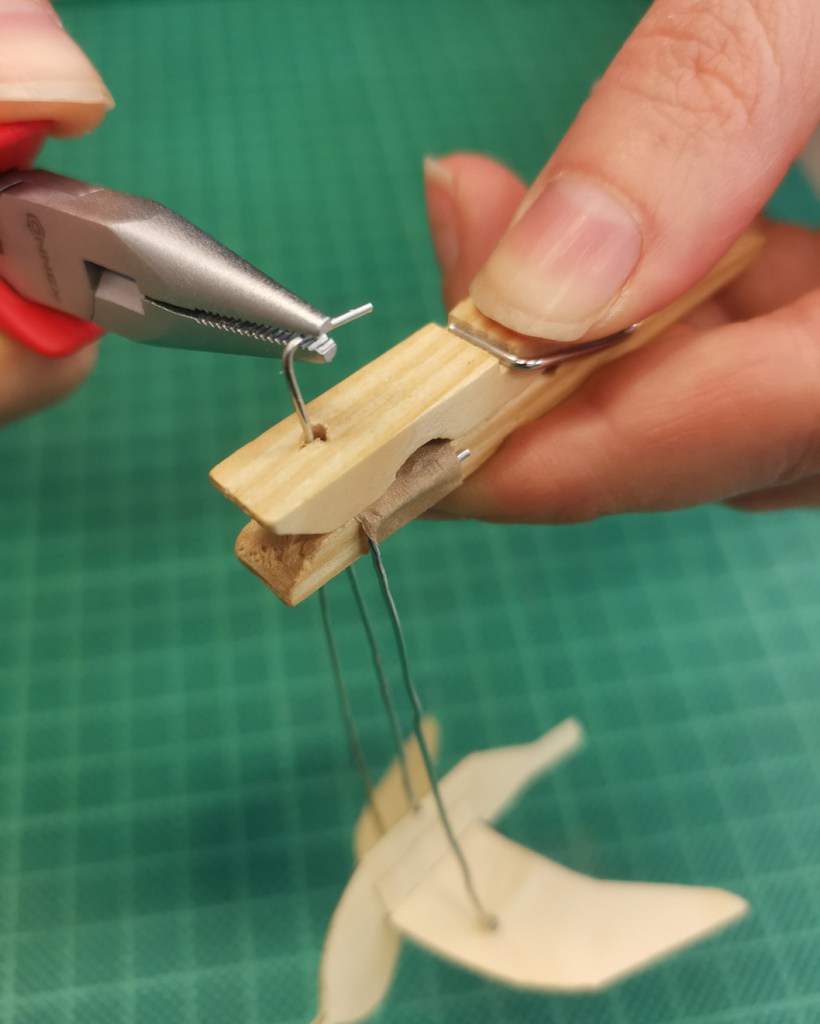 Žico, ki gre skozi ščipalko je potrebno še upogniti in nato prilepiti na ščipalko. Preden jo prepognemo preverimo kako dolg naj bo ukrivljen del. Krila naj bodo pri zaprti ščipalki usmerjena navzdol, da bo ptica lahko letela. Žico lahko prepognemo večkrat, da vidimo, kdaj se krila dobro premikajo. Ko smo zadovoljni s premikanjem kril prilepimo še zadnjo žico na ščipalko. Ptica je pripravljena, da poleti!