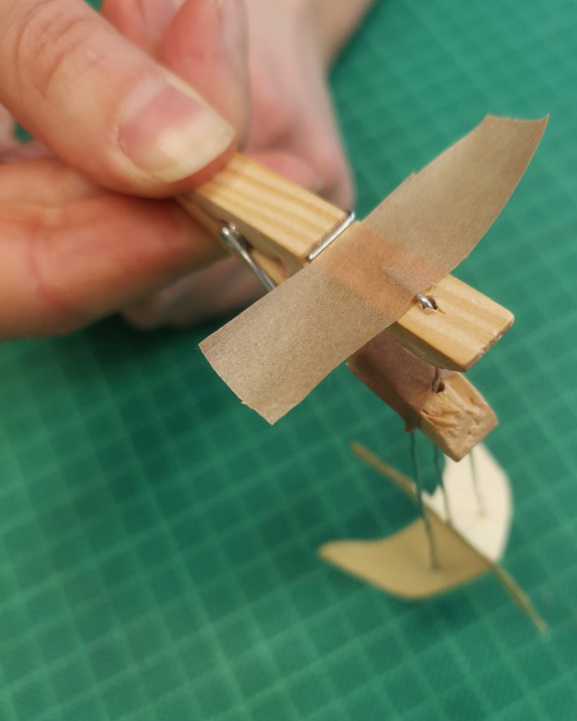 Najprej pritrdimo žici obeh kril. Žici postavimo ob rob ščipalke kot je vidno na fotografiji. Postavimo ju čim bolj v linijo z luknjo v ščipalki. Nato ju tesno ovijemo s krep selotejpom. Pritrjevanje bo lažje, če nam pri tem nekdo pomaga in drži ščipalko odprto.