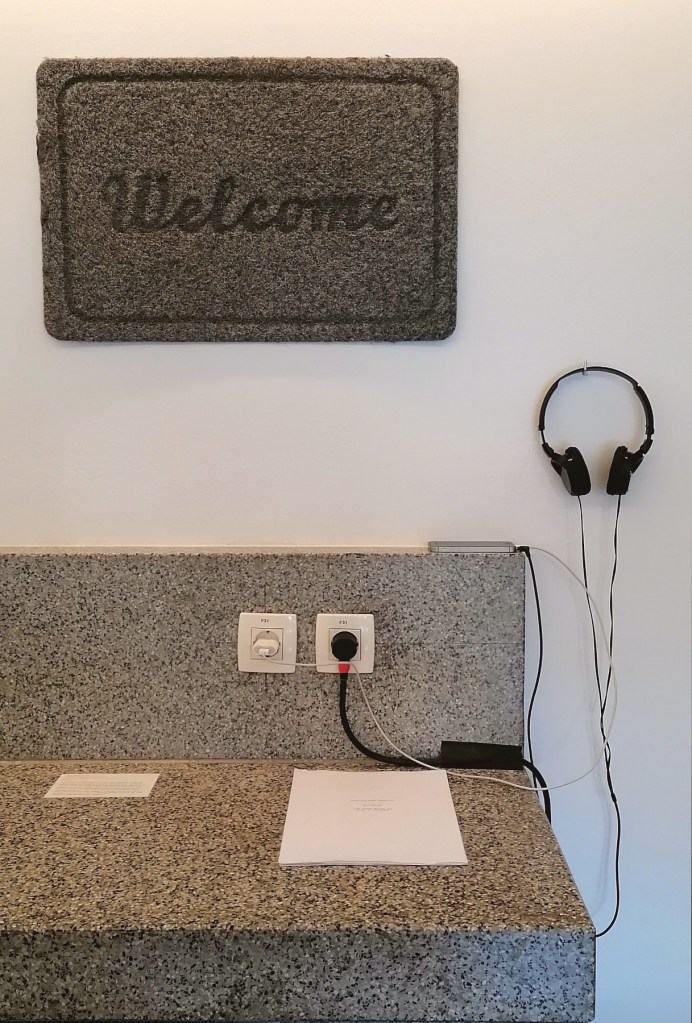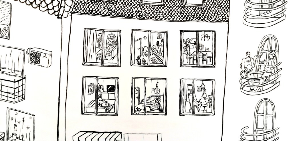Med najbolj neposredne predstavitve sosedskih odnosov na razstavi sodi delo Lenarta Merlina z naslovom Jebem vam mater smrdljivo. Delo, sestavljeno iz zvočnega posnetka, transkripcije in obešenega predpražnika, predstavlja avtorjevo pikantno soočenje z naporno sosedo, s katero so se konflikti v času karantene le še zaostrili. Na zvočnem posnetku lahko poslušamo skrivoma posnet pogovor med umetnikom in njegovo sosedo, s katero si po besedah avtorja delita tudi steno v njegovi spalnici. Nejevoljna soseda na posnetku vneto preklinja, nerazumljivo godrnja in se pritožuje, nakar umetniku in njegovi prijateljici očita gibanje po bloku ter ju zmerja z lenima študentoma. Celoten monolog sosede je natipkan na priložen transkript, na obešenem sivem predpražniku pa je pomenljiv zapis besede Welcome. Na nekoliko bolj splošen način se je tematike lotila Petra Korent z delom Skrivni opazovalec. Na velikem formatu je v tehniki tuša na papir upodobila kaotično okolico svojega domovanja in komične prigode znotraj stanovanjskega kompleksa, interakcije med posamezniki, njihove pogovore, krike in vsakodnevna opravila. Njeno delo v celoti sicer spominja na razvpito Dvoriščno okno Alfreda Hitchcocka, kjer se v svojo sobo zaprt protagonist takisto razgleduje po notranjem dvorišču in radovedno opazuje dogajanje v sosednjem bloku. Skozi okna vidimo ljudi, ki jedo zajtrk, gledajo televizijo ali se predajajo spolnim užitkom. Nekateri se družijo na notranjem dvorišču, obešajo perilo, kadijo na balkonu ali sprehajajo psa. V enem izmed oken se nahaja tudi avtoričin avtoportret.